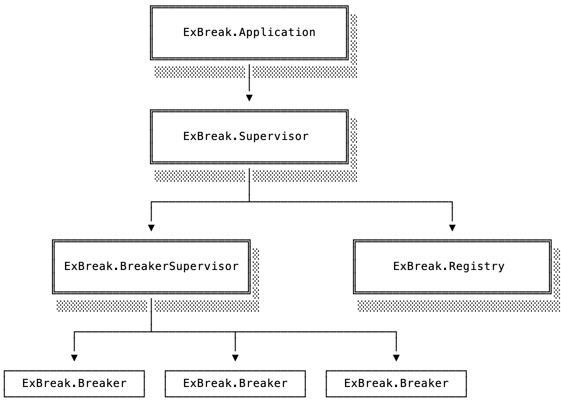 When a call ExBreak.call/3 happens, the ExBreak module asks the ExBreak.Registry to get an ExBreak.Breaker state agent for the function passed to call/3. If an agent already exists, the registry returns it. Otherwise, it starts a new one using ExBreak.BreakerSupervisor and monitors it.