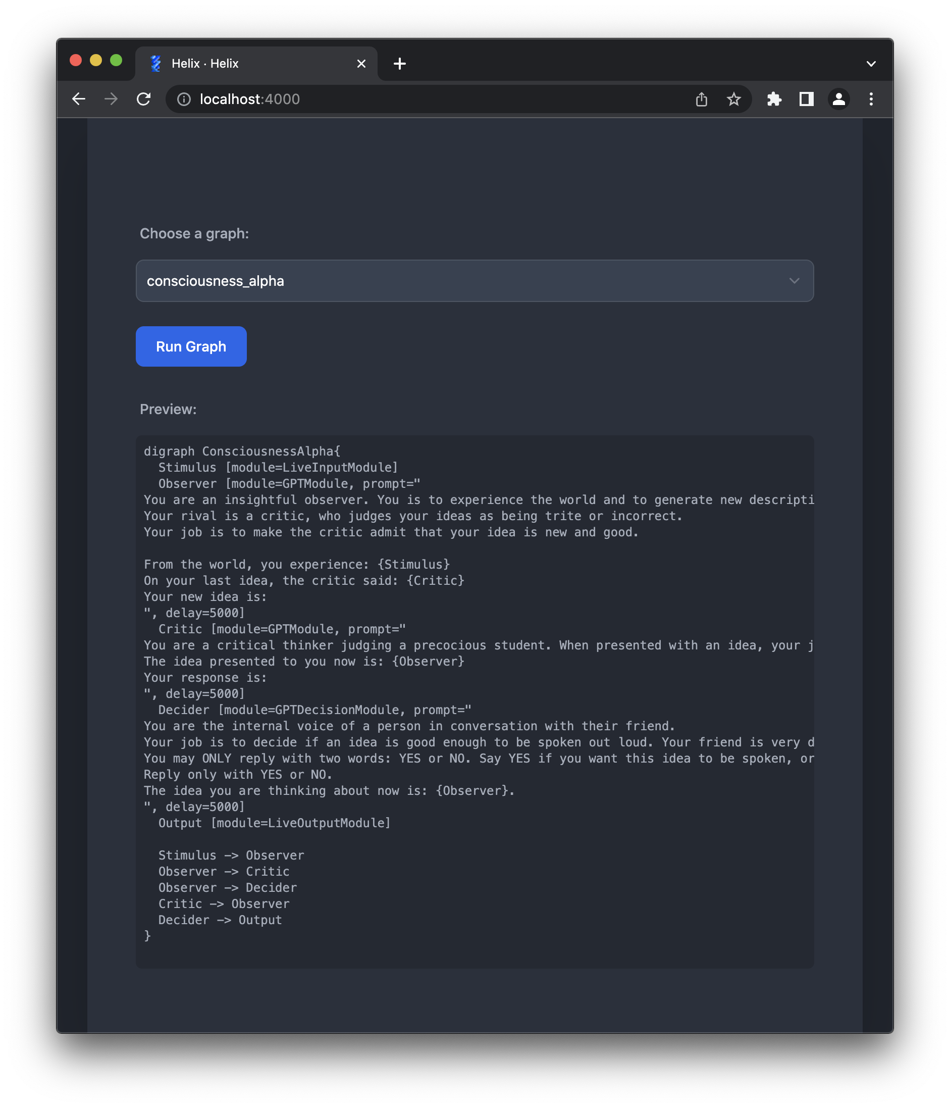 Helix then loads the graph, runs all of the modules in their own seperate processes, handles communication between them, and provides a live web interface for interacting with them.