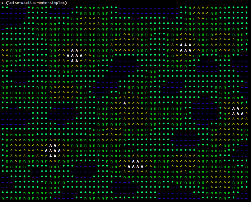 > (loise-ascii:simplex)We can, of course, pass new options to the function. The following shows the addition of alpine forests and grasslands and greatly increasing the map area in the terminal: