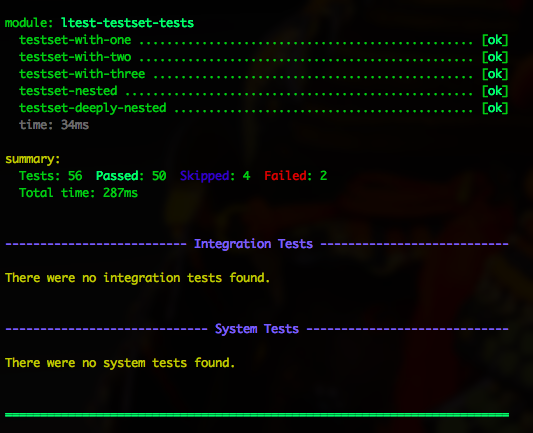 Furthermore, ltest supports separating unit, integration, and system tests.