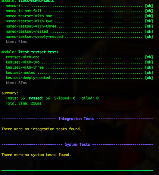 (deftest ...)for standard unit tests(deftestgen ...)for writing tests with generators, including the standard EUnit test fixtures (see naming caveat below)(deftestskip ...)for skipping unit tests(list ...)-wrapped tests (of arbitrary depth) for use as test sets(tuple ...)-wrapped tests for naming/describing tests (first element of tuple)(behaviour ltest-unit)- annotating a test module to be run as a unit test(behaviour ltest-integration)- annotating a test module to be run as an integration test(behaviour ltest-system)- annotating a test module to be run as a system test- A custom test runner that over-rides EUnit behaviour and aesthetics