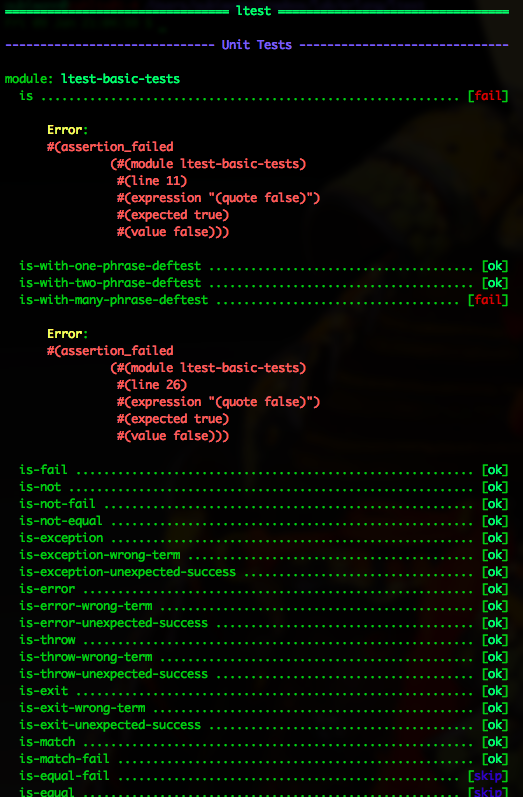 ltest now includes a test runner which overrides the EUnit handlers with its own. Here's what the output looks like with failing and skipped tests: