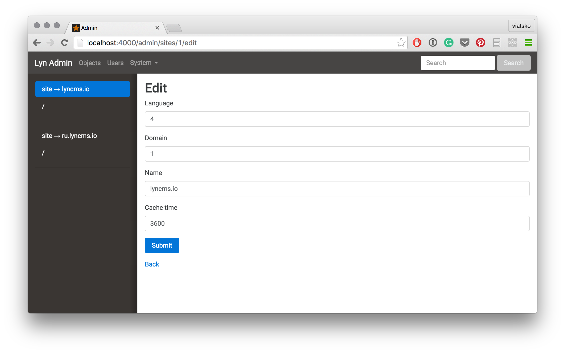 Notice currently I didn’t include scripts to install starter database, but make sure you at least created some languages in admin panel (/admin/languages) before working with objects tree. Installation scripts coming soon once object tree will be ready.