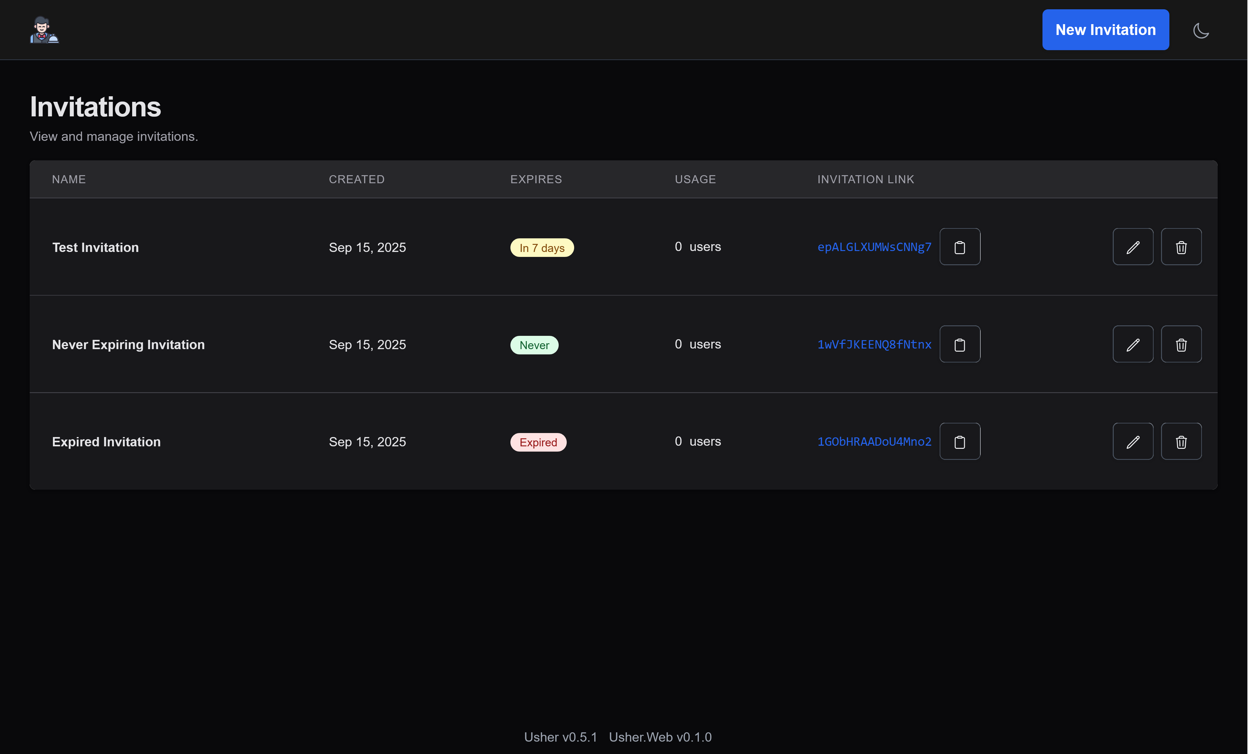 - Create invitation links with custom names and expiration dates (including perpetual links).